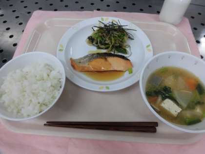 今日の献立 ごはん 牛乳 魚の照り焼き 野菜ののり和え 豚汁