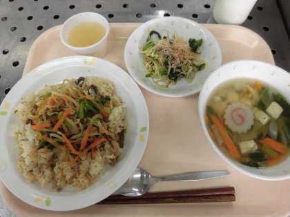 今日の献立 ビビンパ風ごはん 牛乳 中華スープ 野菜のおかかかけ りんごゼリー