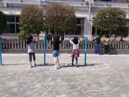 仲良し3人が、鉄棒をしてる姿がかわいらしく微笑ましです。