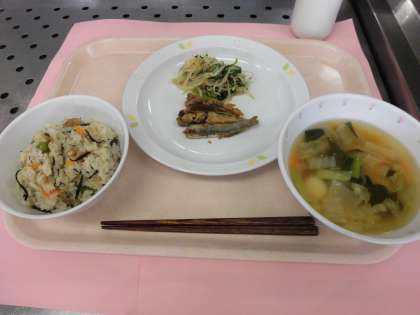 今日の献立 ひじきごはん 牛乳 白玉スープ いわしのガーリック揚げ 和風サラダ