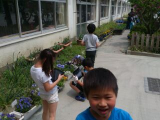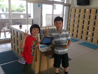 校庭の草花の写真をタブレット端末で撮影し、そのまま、教室での学びに活用します。