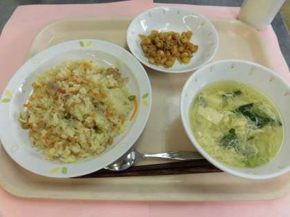 今日の献立 子ぎつねごはん 牛乳 かきたま汁 大豆とじゃこの甘辛あげ
