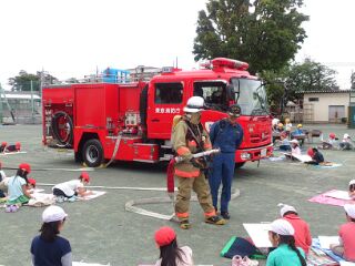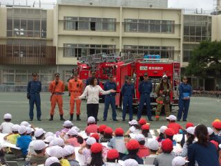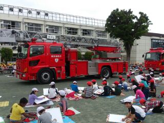 桜町小学校にはしご車、ポンプ車、救急車がやってきました。