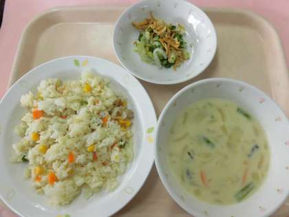 今日の献立 三色ピラフ 牛乳 クリームスープ ごのうチップサラダ