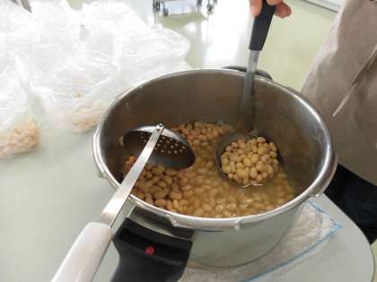 材料は、富山のお店から取り寄せた、北海道大豆(とよまさり)、米こうじ、塩で作ります。前日一晩大豆を水につけておき、大豆が約2倍ほどに水分をふくんでふくらみました。