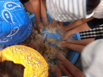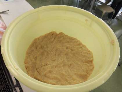 実習当日の朝、保護者の協力で圧力なべで大豆をやわらかくゆで、児童一人一人に少しずつ大豆をつぶしてもらいます。大きなたらいに塩とこうじを混ぜ、そこにつぶした大豆を入れます。全員で交代で混ぜながら、最後に大豆をゆでたときにできた種水を加え(どろあそびのような感じで混ぜます)、団子状に丸めた大豆をたるのなかに「えい!!」と投げつけて完成です。あっという間の45分間。さて4ヶ月後にこのみそはうまくできるでしょうか?お楽しみに!!保護者ボランティアありがとうございます。