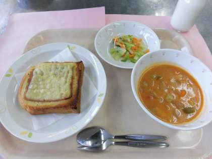今日の献立 ハムチーズトースト 牛乳 鶏肉のトマトソース煮 キャベツサラダ