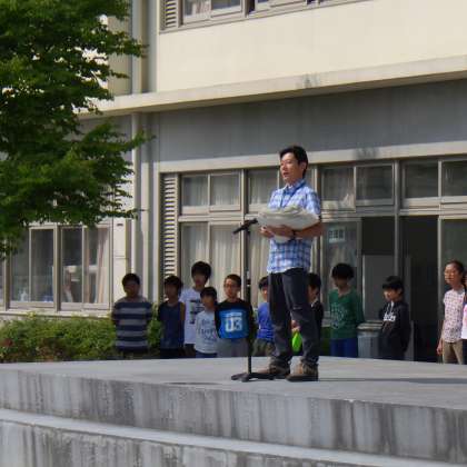 今日の児童朝会で、65周年の航空写真の図柄について、校長先生からお話がありました