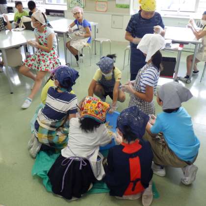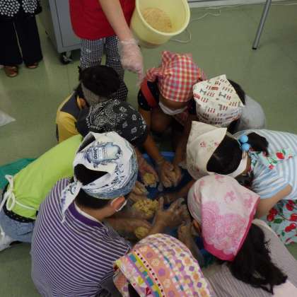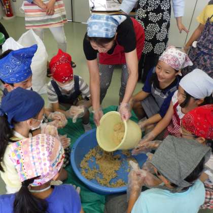 5年生は、毎年みそづくりに挑戦しています。今日は、みその仕込みの時間です。おいしいお味噌ができるといいですね。この味噌は、味噌汁づくりで使われます。
