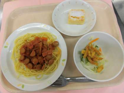今日の献立 スパゲッティナポリタン 牛乳 パリパリサラダ チーズケーキ