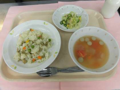 今日の献立 鶏ごぼうピラフ 牛乳 トマポテスープ ツナサラダ