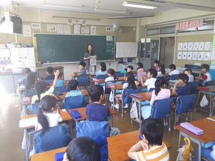 1年生が朝のあいさつの後、一人一人の子の名前をよんで、健康観察をしています。