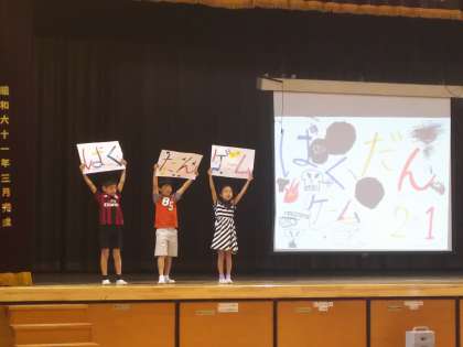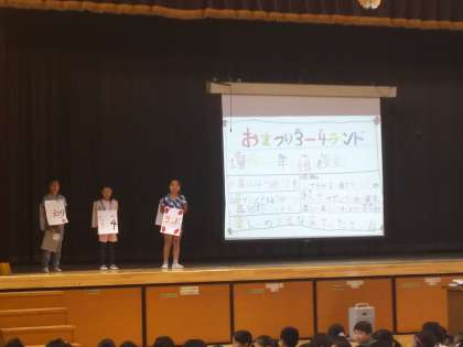 2年生以上の学年の子どもたちが、創意工夫して楽しいお店を経営する子どもフェスティバルのPR集会が開かれました。