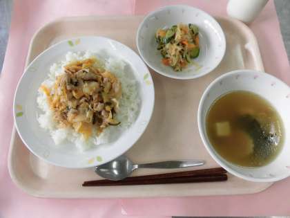 今日の献立 キムチ丼 牛乳 わかめスープ 切干大根のサラダ