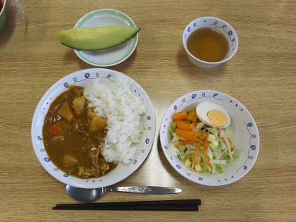 メニューは、カレーライス、サラダ、メロンです。