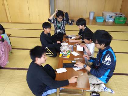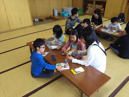 お部屋で河口湖移動教室の思い出をハガキに書きます。