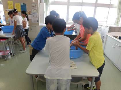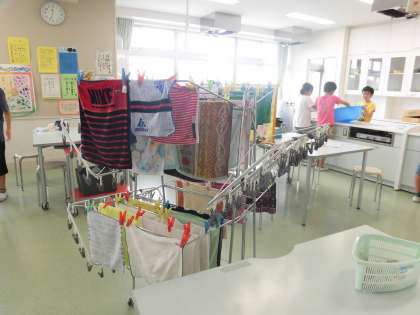 暑い季節を快適にすごすくふうを考える という単元で、家庭科室で手あらい実習しました。