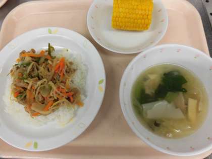 今日の献立 炒めナムル丼 牛乳 ワンタンスープ 蒸しとうもろこし