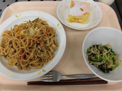 今日の献立 ソース焼きそば 牛乳 ナムル ヨーグルトと桃のケーキ