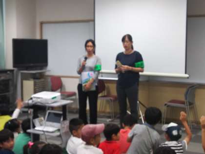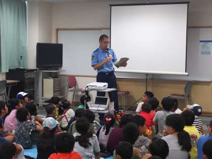 上映に先立ち玉川警察署の交通安全課の係長さん、生活安全課の婦警さんにお越しいただき、交通安全と防犯について子どもたちにお話をしてくださいました。
