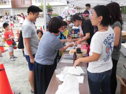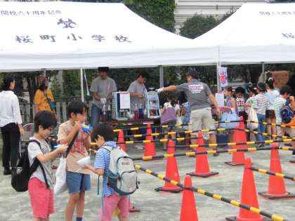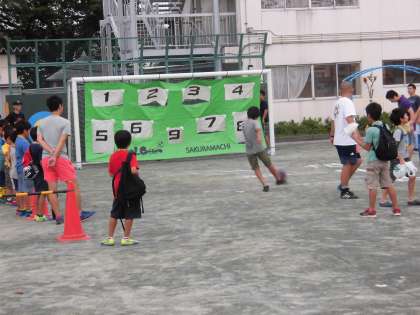 校庭では、桜町SC主催のキックターゲット、おやじの会主催のソースせんべい、かき氷が行われました。ゴールの得点めがけ一生懸命ボールを蹴る姿、大きく口を開けてかき氷やソースせんべいを食べる姿が見られました。
