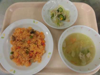 今日の献立 チキンライス 牛乳 白いんげんの田舎風スープ ツナサラダ
