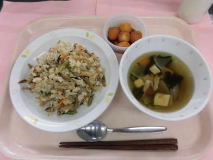 今日の献立 五目ごはん 牛乳 さといも汁 月見だんご