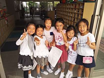 袈裟も元気いっぱい、笑顔いっぱいの桜町小の子どもたちです。