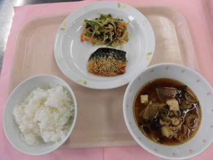 今日の献立 ごはん 牛乳 さばの七味焼き 野菜のからししょうゆかけ どさんこ汁
