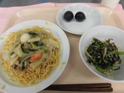 今日の献立 五目あんかけそば 牛乳 こまつなの乾物あえ 巨峰