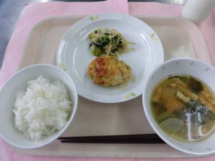 今日の献立 ごはん 牛乳 豆腐入りさくさくつくね 梅おかかあえ じゃがいもとわかめのみそしる