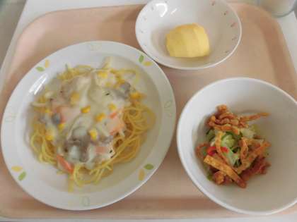 今日の献立 スパゲッティクリームソース 牛乳 パリパリサラダ りんご