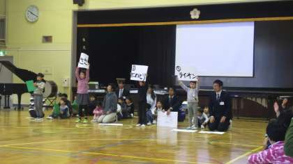 桜町小、尾山台小、奥沢小、八幡中の4校の子どもたちが集り、歌を歌ったり、ゲームをしたりして交流しました。