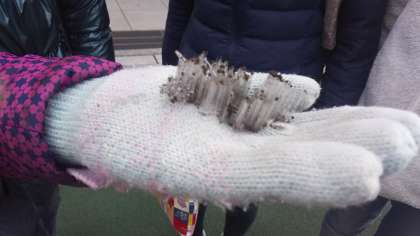 3年生の女の子が、霜柱を持って登校しました。