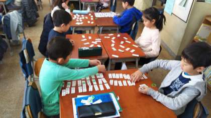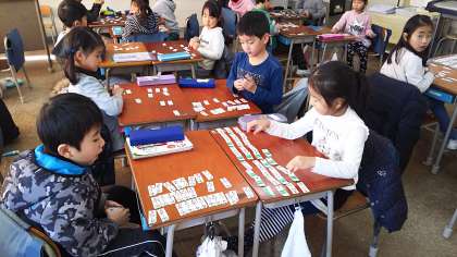 1年生が、カルタ気分で算数の学習を楽しんでいます。