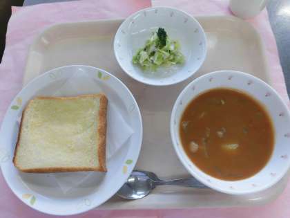 今日の献立 ガーリックトースト 牛乳 トマトシチュー グリーンサラダ