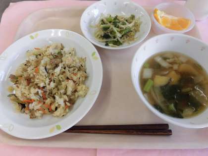 今日の献立 五目ごはん 牛乳 すいとん 野菜のごまだれかけ デコポン