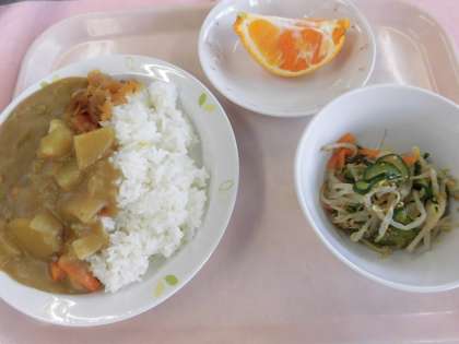 今日の献立 カレーライス 牛乳 福神漬 こんにゃくサラダ デコポン