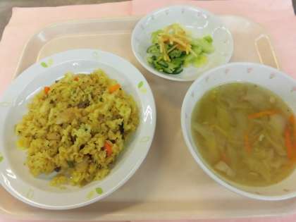 今日の献立 えび入りカレーピラフ 牛乳 ジュリアンスープ じゃがいものハニーサラダ