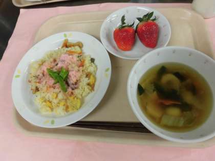 今日の献立 ちらしずし 牛乳 白玉スープ いちご