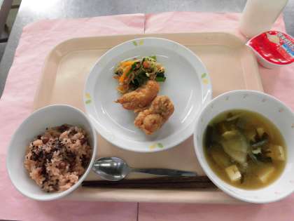 今日の献立 赤飯 牛乳 鶏肉のからあげ おひたし みそしる お楽しみデザート