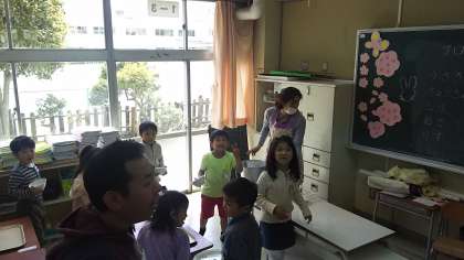 1年生の給食には、安全管理のため、二年生以上の保護者の方々がお手伝いにきてくれています。