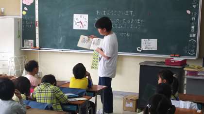 6年生の男の子が、1年生に優しく読み聞かせをしてくれています。
