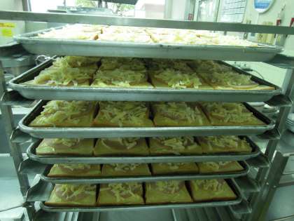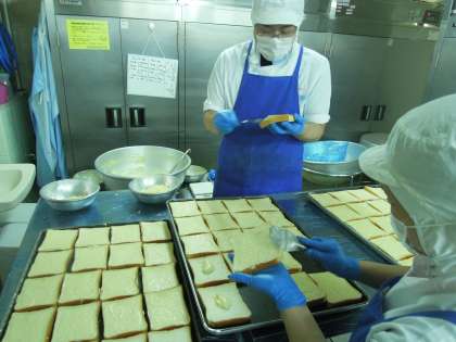 ハムチーズトーストは、パンにマスタード・マヨネーズを塗り、ハムとチーズをのせて焼きあげます。調理員さんがパンの端まで丁寧にマヨネーズをぬってくれていました。給食室は大忙しでしたが、子どもたちは喜んで食べてくれました。