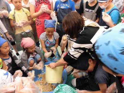 で、約4キロの味噌ができあがります。今日は、家庭科室で圧力鍋を使って柔らかくした大豆を、学級全員とボランティアの保護者数名と一緒に指でつぶし、米こうじと塩と混ぜて、最後にたるに投げ入れました。
