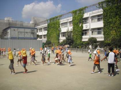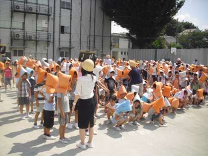 地震→出火という想定で、校庭に避難しました。