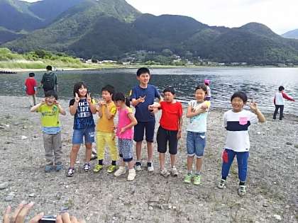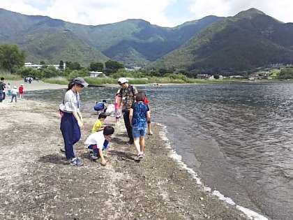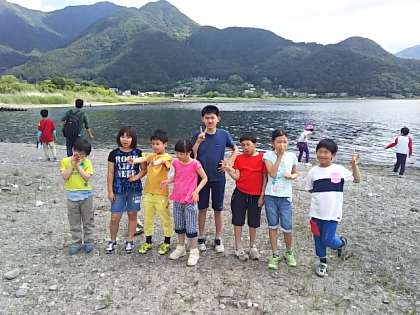閉園式の前に河口湖でひと遊び。みんなで記念写真も撮りました。