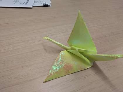 きれいなラメ入りの折り紙でパタパタ折り鶴をつくってくれました。