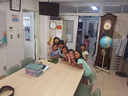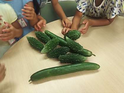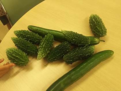 北校舎の省エネ対策に設置しているみどりのカーテンでゴーヤやキュウリがとらました。