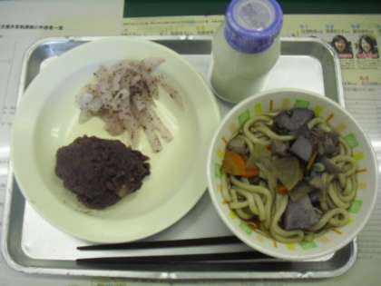 9月17日(金)の給食のメニューは、「おはぎ、けんちんうどん、大根のゆかりあえ、牛乳」です。お彼岸の入りが20日なので、おはぎをいただきました。
